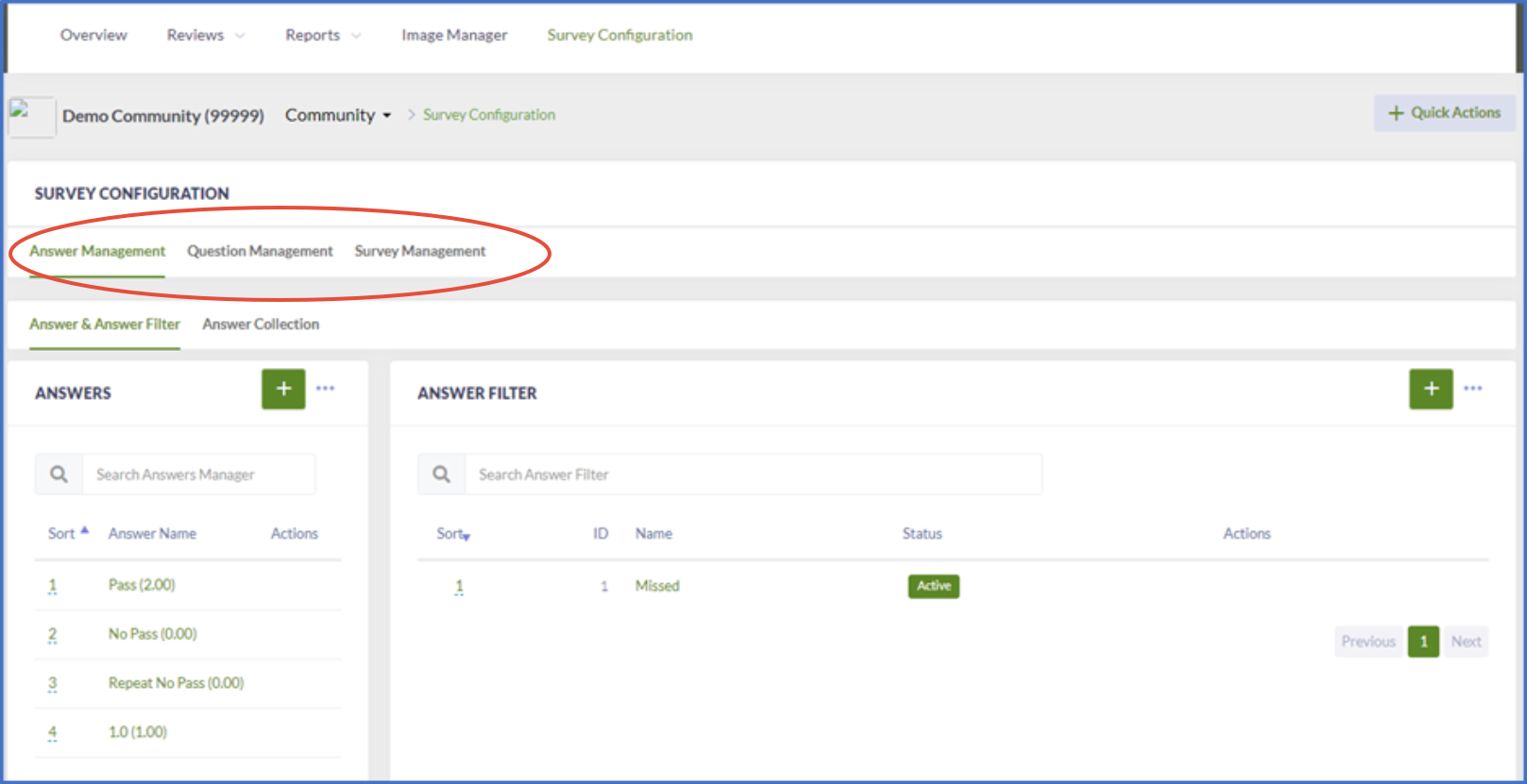 Notice you have areas called Answer Management, Question Management and Survey Management. You will be in these sections working to build your question and answer banks.